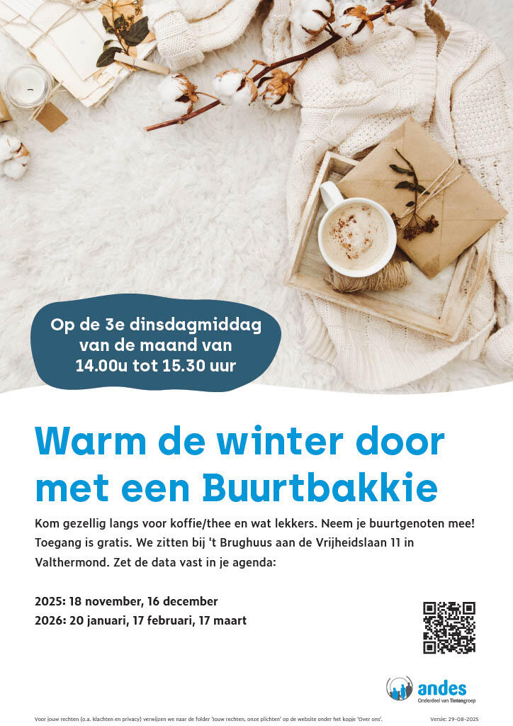 Na een gezellige eerste editie gaan we door! Welzijnsorganisatie Andes organiseert deze winter elke derde dinsdagmiddag een Buurtbakkie in ’t Brughuus. Een fijne plek om elkaar te ontmoeten, bij te praten of gewoon even te genieten van een kop koffie.